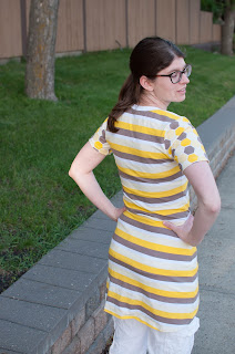 This outfit features the same Seville Cropped Cardigan but this time I switched it up and made a Girls' Weekender Tunic from 5 out of 4 Patterns with a high low hem in a short sleeve version. The fabric is from a flawed mystery box I bought from Sweet 'n Charmed custom fabric. There were some real gems in that mystery box! I love how springy this outfit feels. It makes up for the face that it is -10 degrees celsius outside (14 F) and very snowy... but seriously doesn't that Tunic just make you want to spin in circles?!